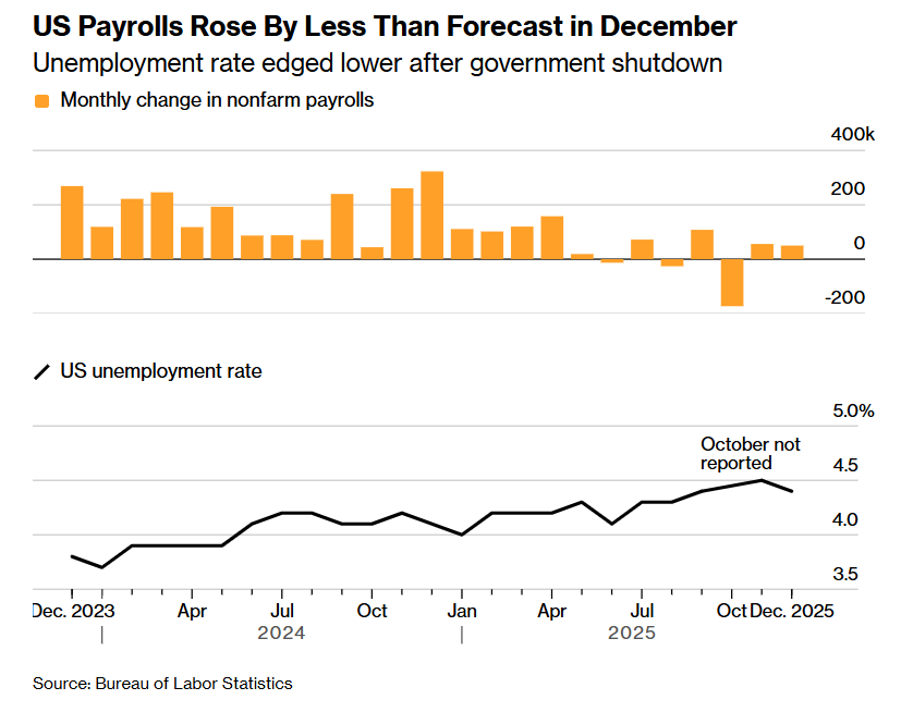 美国劳工统计局上周五公布的统计数据显示,在此前两个月就业数据被大幅下修后(10月更是呈现出就业岗位缩减超10万),非农就业人数上月小幅增加50,000人,仅仅略低于经济学家们普遍预期的6万人增幅。失业率则意外呈现出积极态势,从11月的修正后4.6%显著降至4.4%,在创纪录的联邦政府长时间停摆结束后转向回落,优于经济学家们一致预期的4.5%失业率,反映出直接失业人数显著减少。美国劳工统计局周二公布的12月CPI则显示核心CPI呈现稳步降温,但是仍然非常顽固且不足以推动美联储在本月降息。