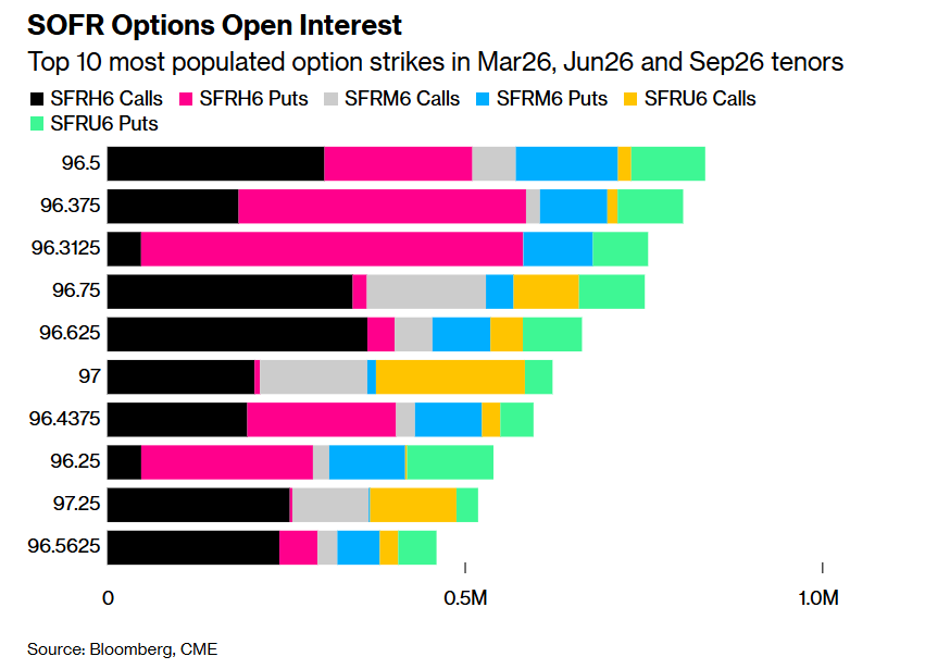 上图为SOFR期权未平仓合约图示——2026年3月、6月和9月期权的前10大期权行权价。