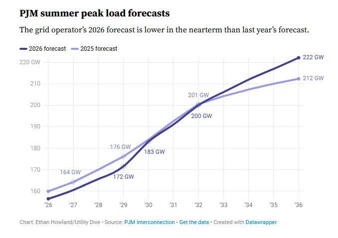 尽管下调近期预测,PJM对未来十年的电力需求增长预期实际有所上调。该电网运营商预计,到2036年夏季峰值负荷将以年均3.6%的速度增长至约222 GW,高于此前3.1%的预测。未来10年总增长量约为65.7 GW。