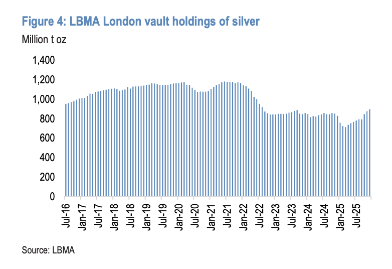 根据LBMA数据,自去年9月以来伦敦金库白银总持有量已增加约1.04亿盎司,规模与同期COMEX库存减少量相近。不过 Metals Focus 指出,其中可自由流通(非ETP持有)的白银库存增幅约为6000万盎司,已从9月底的1.36亿盎司低点回升至去年底的近2亿盎司水平。
