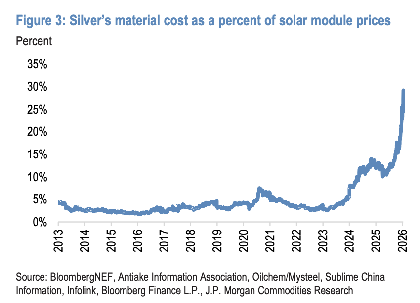 报告表示,工业需求正面临日益严峻的压力。摩根大通早在去年12月便警示,白银价格上涨可能在未来数年威胁高达5000-6000万盎司的太阳能产业需求。随着银价持续攀升,成本压力进一步凸显。