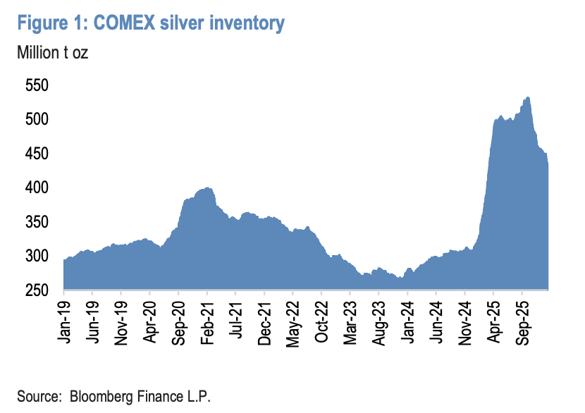 数据显示,COMEX白银库存已从10月初约5.3亿盎司的高点下降约1亿盎司至约4.3亿盎司。值得关注的是,今年1月以来库存流出明显加速,近期日均流出量接近200万盎司。尽管如此,当前库存仍较2024年美国大选前水平高出约1.25亿盎司。从规模看,这一库存增量约相当于全球全年白银矿产供应量的15%。