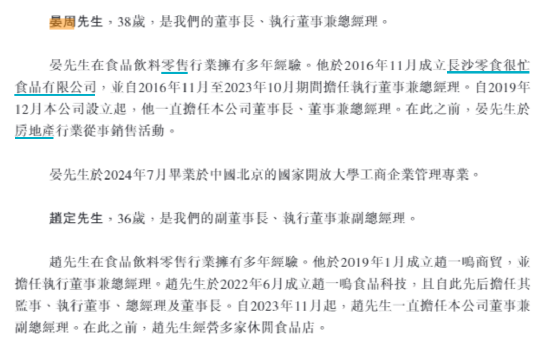 公司股权方面,招股书披露,截至最后实际可行日期,38岁的鸣鸣很忙董事长晏周与36岁的公司副董事长赵定通过《一致行动协议》共同控制约62.60%的投票权。