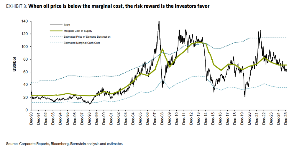 然而,这正是逆向投资者的机会所在。伯恩斯坦认为,当市场盯着短期的供需失衡时,却忽视了支撑长期油价的十个关键支柱。对于拥有耐心资本的投资者而言,当前高达60-65美元/桶的价格对行业来说已不可持续,资本正在逃离,而这往往是周期性底部最明确的信号。正如那句老话:低油价本身就是低油价的解药。