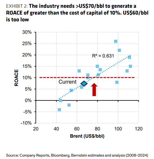伯恩斯坦的测算显示,石油行业平均需要50-55美元/桶的油价才能实现盈亏平衡。如果油价维持在60美元/桶,行业的资本回报率将仅为低至中个位数。