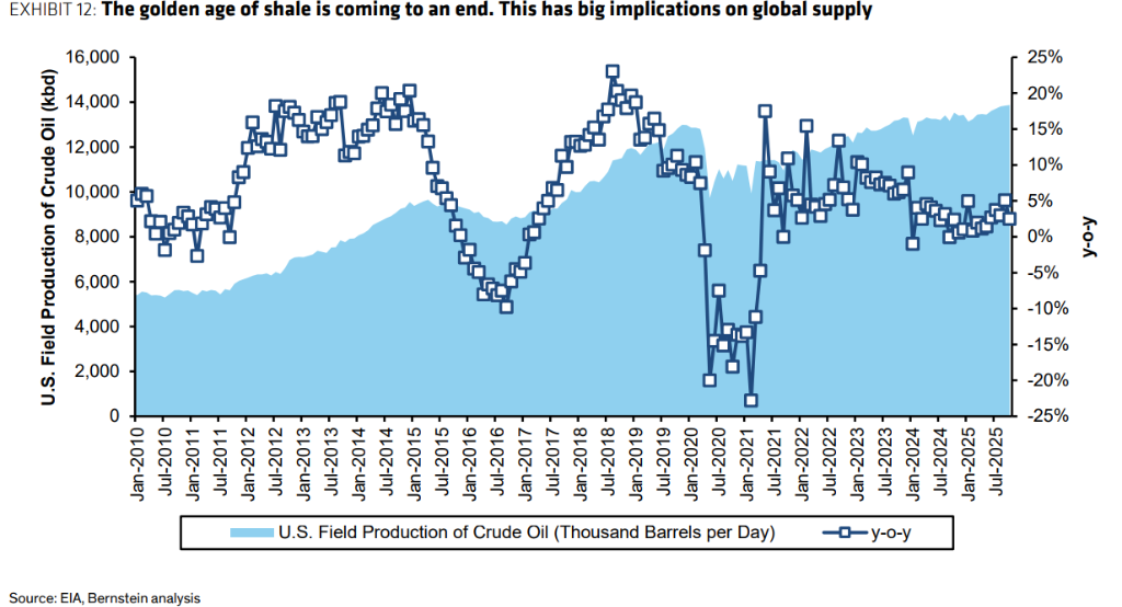但这“黄金时代”正在落幕。 Eagleford和Bakken等主要盆地已进入成熟期,即便是核心的二叠纪盆地(Permian),其一级优质区块也面临枯竭,产量增长显示出触顶迹象。