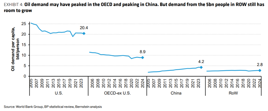 虽然经合组织(OECD)国家和中国的需求可能见顶,但在中国和OECD之外,生活着50亿人口的“全球南方”国家(如东南亚、印度、中东和非洲),其人均石油消费量仅为西方的一小部分。