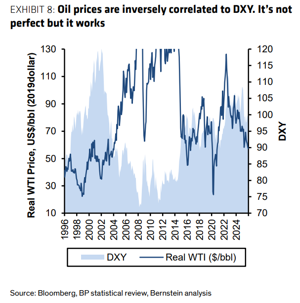 过去30年的数据显示,美元指数(DXY)与实际油价呈强负相关。