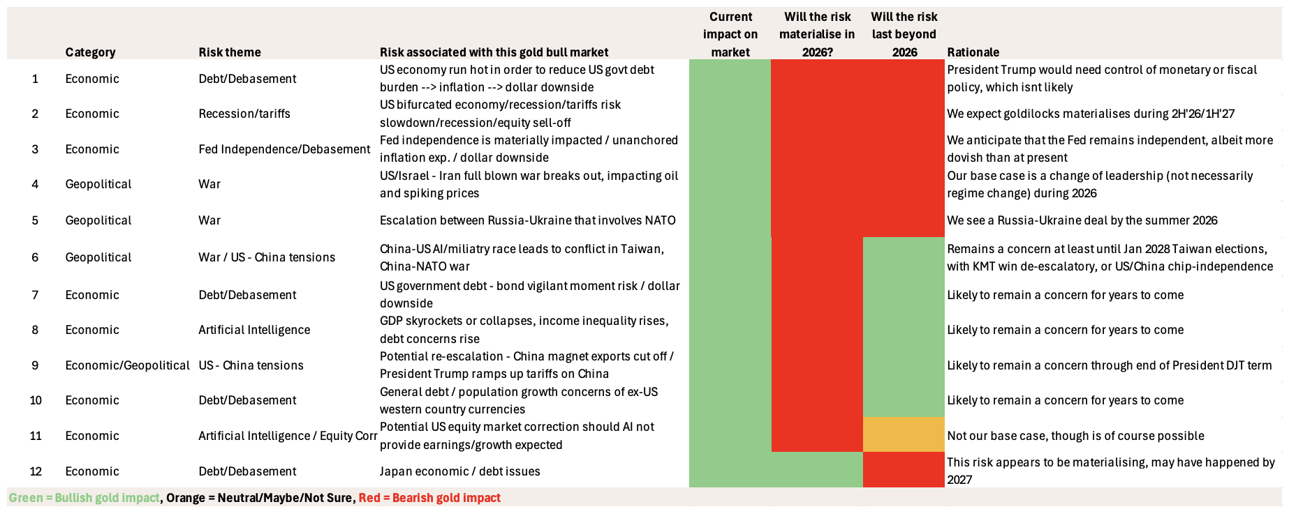 花旗评估了支撑黄金投资配置的12项重叠的地缘政治和经济风险。估计约半数风险将在2026年内不会发生或完全消失。