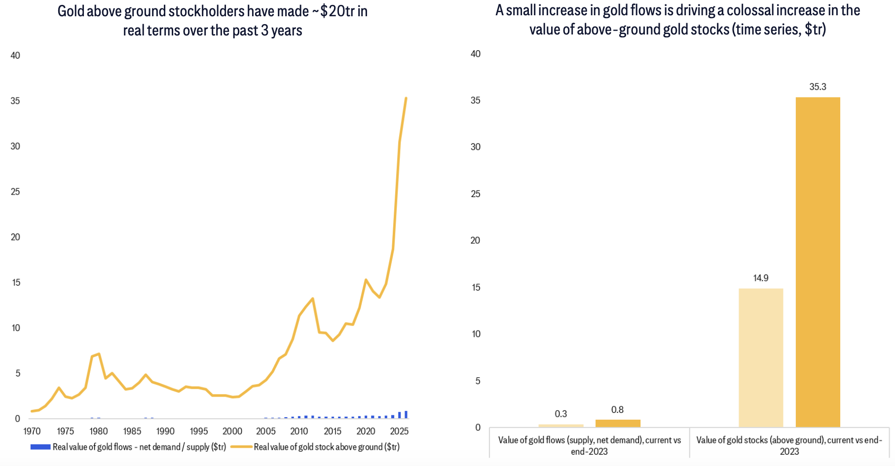 如果全球平均配置水平从当前的4.1%增至5%(仅0.9个百分点的变化),将需要相当于11年矿山供应量,或过去数千年积累的所有珠宝和金条库存的一半。显然,实物市场无法承载如此规模的财富转移,价格必须大幅上涨以平衡供需。
