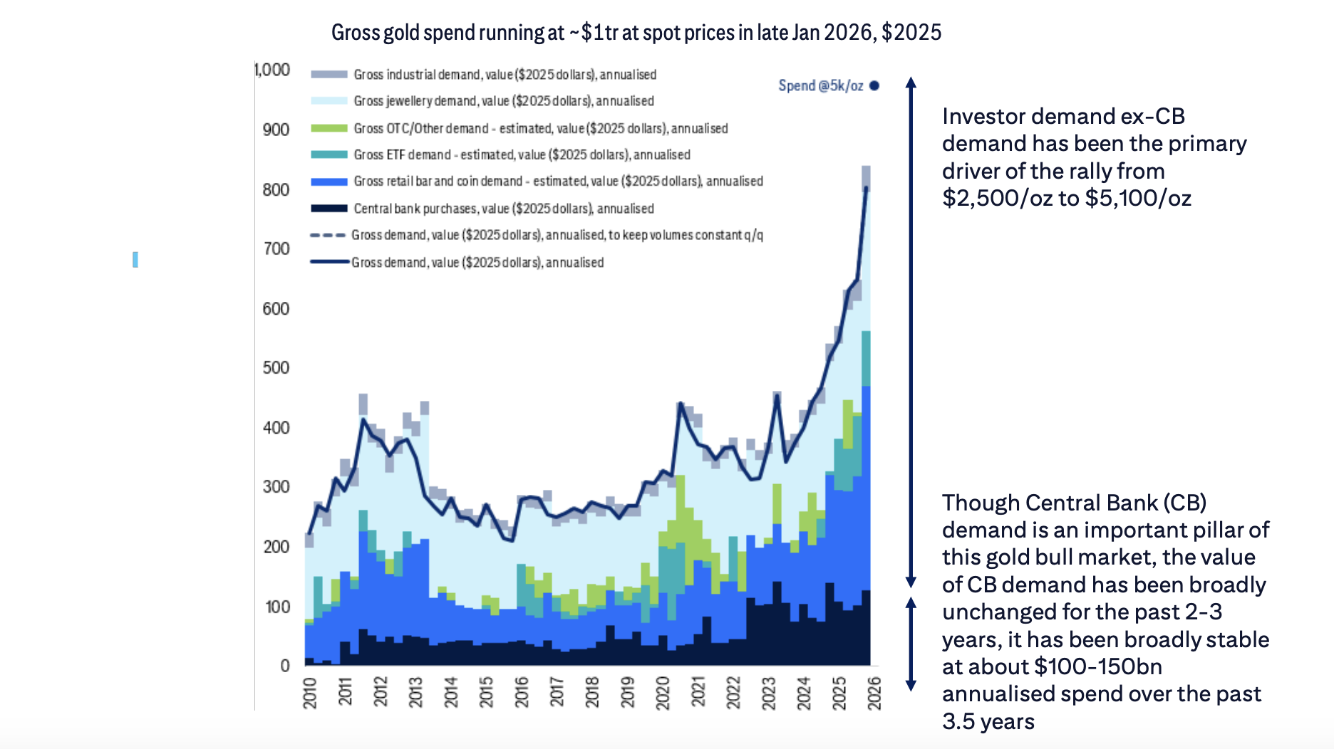 央行对黄金的需求规模在过去2–3年大体不变,在1000亿–1500亿美元之间。而市场化投资者的资本配置达到历史最高水平,约1万亿美元。