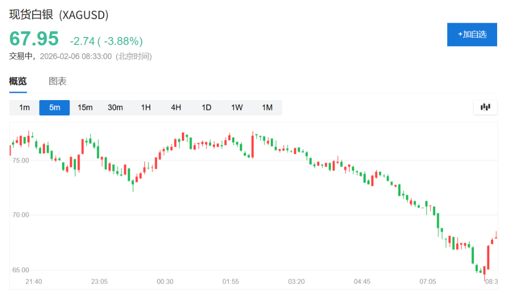 华尔街见闻提及,在芝加哥商品交易所再度上调保证金的重压之下,现货白银周五亚洲时段延续暴跌趋势,日内跌幅一度超10%,跌至64美元关口后反弹收窄跌幅。