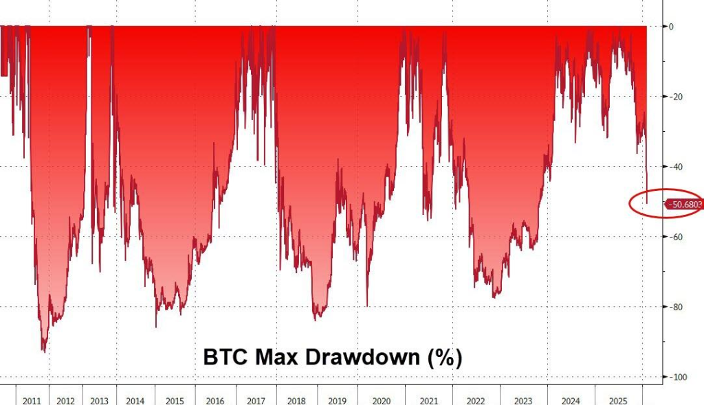科技股的失速,迅速点燃了更高杠杆资产的连锁反应。比特币在亚太时段一度崩跌,随后日内走V转涨,盘中跌破6.1万美元,比特币价格较去年10月峰值已腰斩。