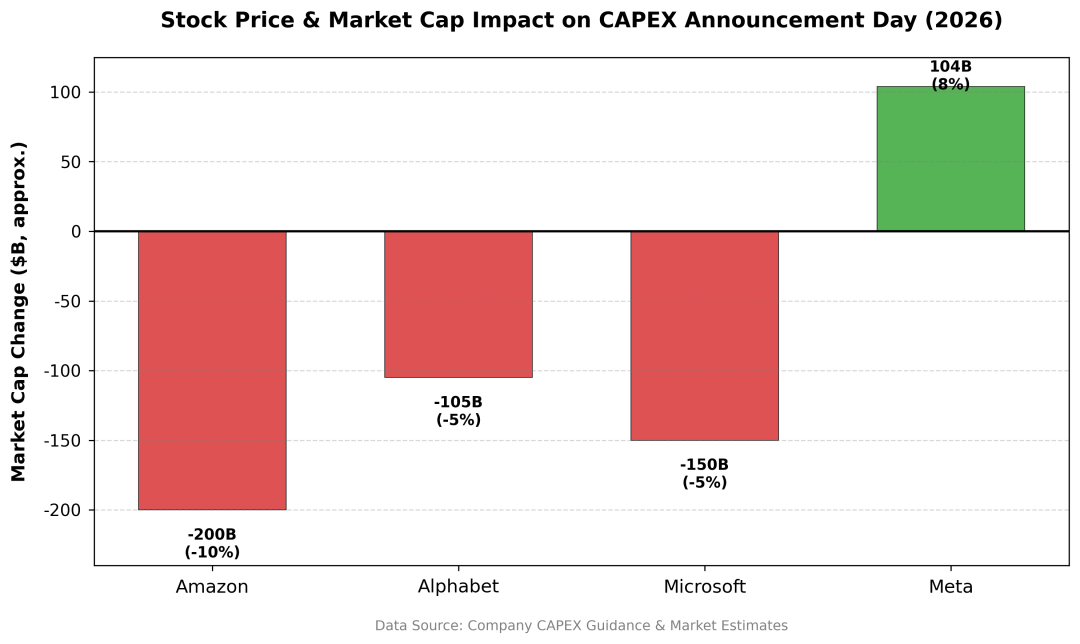 然而,巨额资本开支计划的相继落地,直接引发资本市场集体承压:亚马逊、Alphabet、微软股价大幅下挫,市值蒸发规模达数百亿乃至数千亿美元;Meta虽借广告业务的稳健增长短暂冲高,最终亦难逃连续下跌的命运。