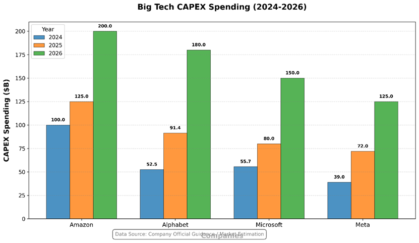 新一季财报数据显示,亚马逊、Alphabet、微软、Meta四大美国科技巨头,正开启一轮以AI基础设施、云服务数据中心及全球算力布局为核心的历史性资本支出(CAPEX)扩张周期。