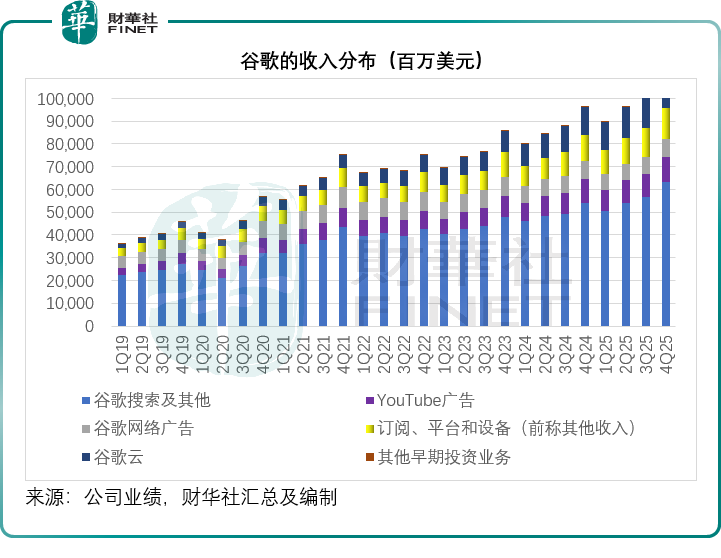 2025年第4季,谷歌搜索及其他广告营收增长16.73%,至630.73亿美元,所有主要垂直领域均保持增长,其中零售贡献最大。YouTube广告营收增长8.69%,至113.83亿美元,由直接响应广告驱动,增幅有所减缓,管理层解释是因为受到了与2024年美国大选相关的强劲支出的同比基数效应影响。同理,网络广告营收78.28亿美元,下降1.58%。订阅、平台和设备季度营收同比增长16.72%,至135.78亿美元,得益于YouTube订阅的强劲增长,特别是YouTube Music和Premium,以及Google One因AI方案需求增加而增长。