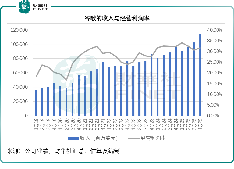 谷歌(GOOGL.US)2025年第4季收入同比增长17.99%,至1,138.28亿美元,高于市场预期的1,114.3亿美元,但是经营利润率却按年下降0.54个百分点,至31.57%,主要受到Waymo因估值上升,而确认21亿美元员工薪酬支出影响。