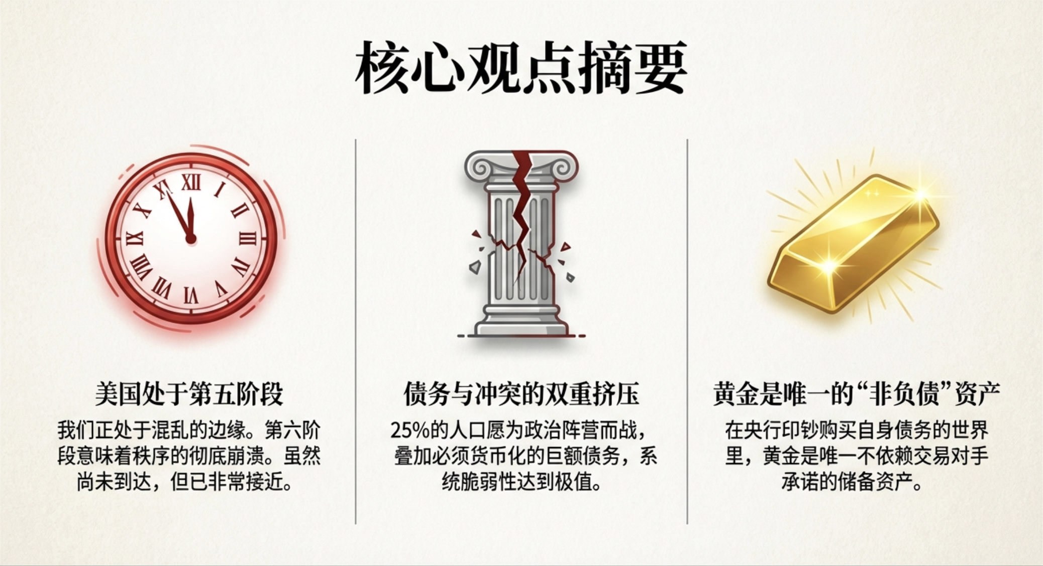 桥水达利欧发出重磅警告:美国已深陷“第五阶段”,处于秩序崩溃与内战边缘。在债务失衡与政治极化下,黄金成为唯一“非他人负债”的避险方舟,应占投资组合的5%-15%。达利欧建议以配置多样化与选择稳定居住地的方式来应对法币贬值与即将到来的动荡周期
