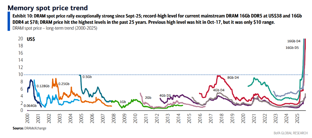 目前,主流的16Gb DDR5现货价格维持在38美元的历史高位,同比涨幅高达709%;16Gb DDR4价格更是达到78美元,同比暴涨2445%。美银美林指出,DRAM价格已触及过去25年来的最高水平,远超2017年10月上一轮周期顶峰时的10美元区间。