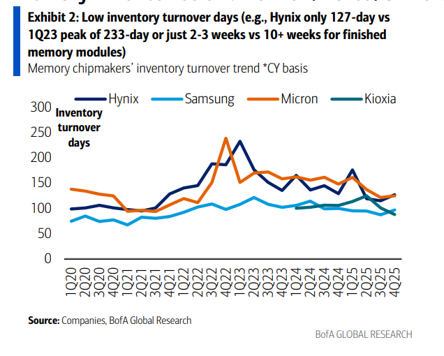 首先,库存水平已经降至“警戒线”以下。 以SK海力士为例,其库存周转天数已从2023年一季度的233天峰值,大幅下降至仅127天。更惊人的是,成品存储模组的库存仅能维持2-3周,而正常水平通常在10周以上。这意味着,一旦需求稍有波动,供应链将面临极大的缺货压力。