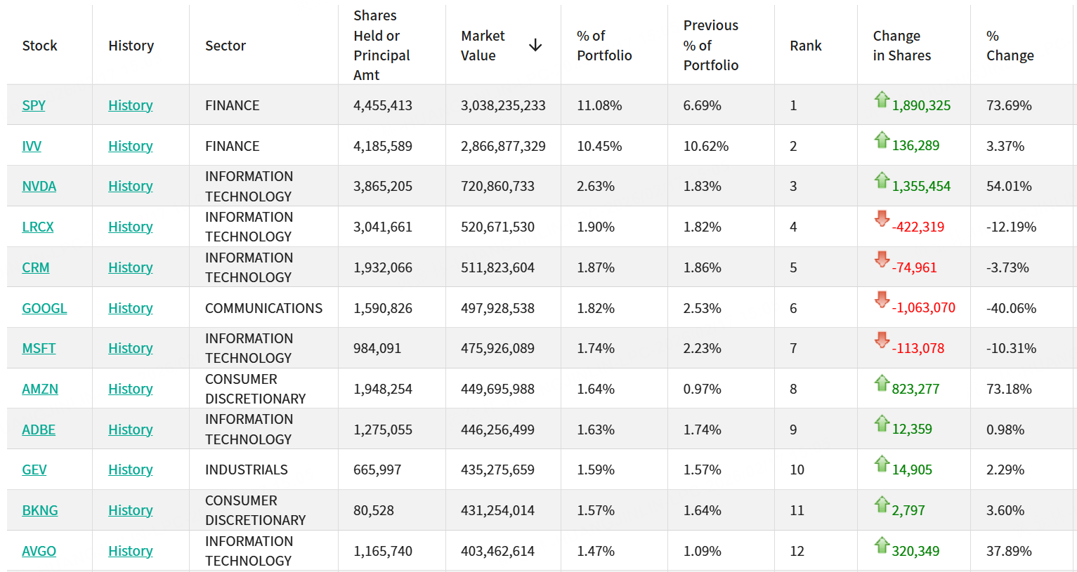 数据不会撒谎。英伟达(Nvidia)的持股数量同比增长 11%,达到 387 万股;半导体设备巨头 Lam Research 的增幅达到 20%;而企业软件巨头 Salesforce 的持仓更是同比暴增 285%,成为增持幅度最大的个股。