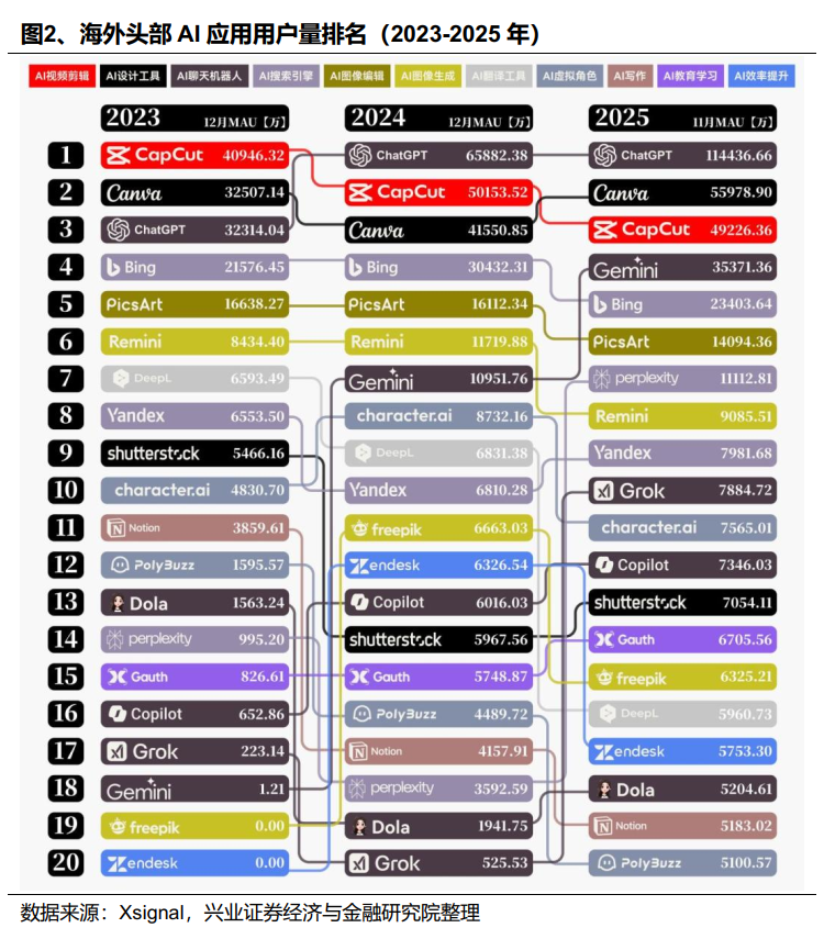 海外,AI应用竞争格局迈入多极化新阶段,多款颠覆性模型密集推出,对国内形成示范效应。海外AI应用竞争格局正从OpenAI独大,逐步转向多极化。ChatGPT仍占据泛化流量核心入口,在聊天、翻译、图像生成等领域占据大部分市场份额,持续领跑全球。2025年9月OpenAI推出视频生成模型Sora后,首周即登顶美国AppStore免费榜,进一步巩固其生态优势。但随着更多大厂密集发力,AI应用竞争格局已明显转向多极化:谷歌凭借GeminiPro系列快速追赶,XAI(Grok)凭借实时数据与差异化体验崛起,Meta、Google、Anthropic等通过集成AI与社交、搜索与生产力工具,构建闭环生态。例如,2026年2月AnthropicPBC推出法律AI插件,引发市场对AI在销售、营销、金融软件等领域替代效应的广泛讨论。与巨头闭环生态形成制衡的是开源力量快速崛起,2026年1月OpenClaw以开源模式爆火,截至2026年2月15日其在OpenRouter平台上的token调用量已位居首位。同时,AIAgent迈向自主智能,2025年1月OpenAI发布首款AI智能体产品Operator,2026年2月Anthropic推出ClaudeOpus4.6和AgentTeams实验功能,有望推动垂直高价值场景AIAgent加速商业化。2026年,海外AI巨头竞赛下,更多颠覆性大模型有望推出,将继续对国内AI应用发展形成示范效应。