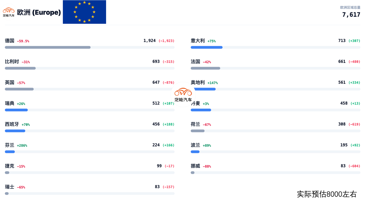 德国、英国这种大基数市场,一旦需求回落,绝对销量下滑就很夸张,在英国已经 不是第一次被 BYD超越,荷兰份额降到 4.3%,挪威 -88%。