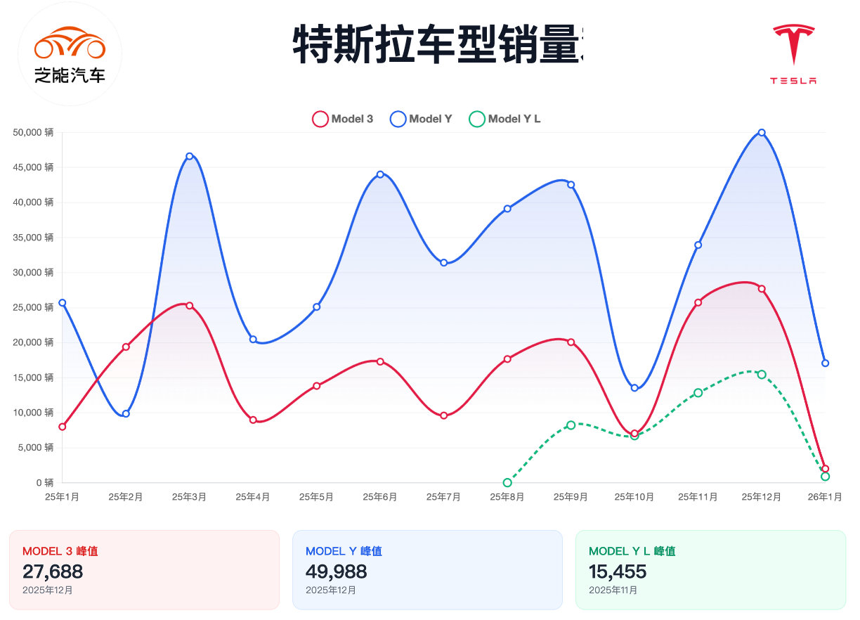 2026年1月的销量约2万台,下降40%,Model 3 销量 2015 辆,Model Y 销量 17073 辆,Model Y 长续航版销量 910 辆,总销量合计 19998 辆,从趋势来看,在2026年电动汽车残酷的竞争环境下,特斯拉在中国的销量不太好估计。
