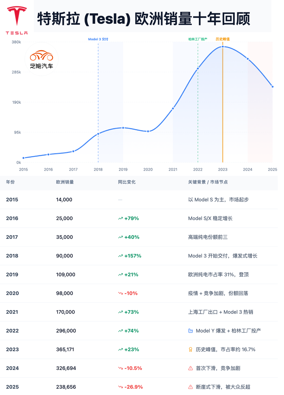 特斯拉在欧洲整体销量已经下降了,是明显走弱的,下面是个趋势图。