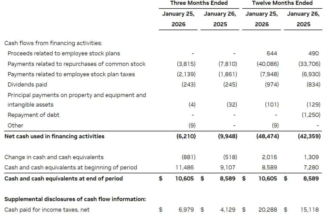 在2026财年,英伟达以股票回购和现金分红的形式向股东返还了411亿美元。截至第四季度末,该公司的股票回购授权额度仍有585亿美元未使用。