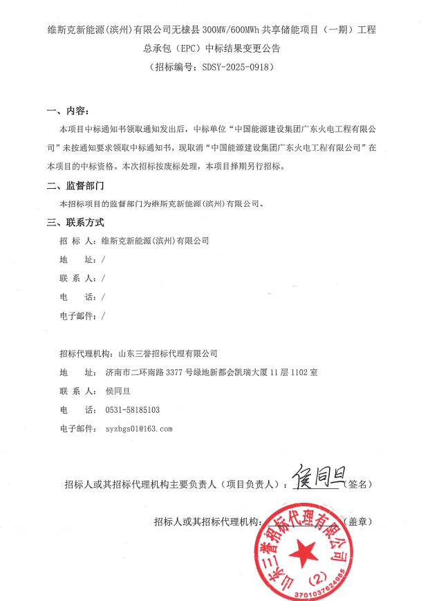 近日,维斯克新能源(滨州)有限公司发布无棣县300MW/600MWh共享储能项目一期EPC中标结果变更公告,《公告》提到,中标单位中国能源建设集团广东火电工程有限公司未按通知要求领取中标通知书,现取消“中国能源建设集团广东火电工程有限公司”在本项目的中标资格。本次招标按废标处理,本项目择期另行招标。