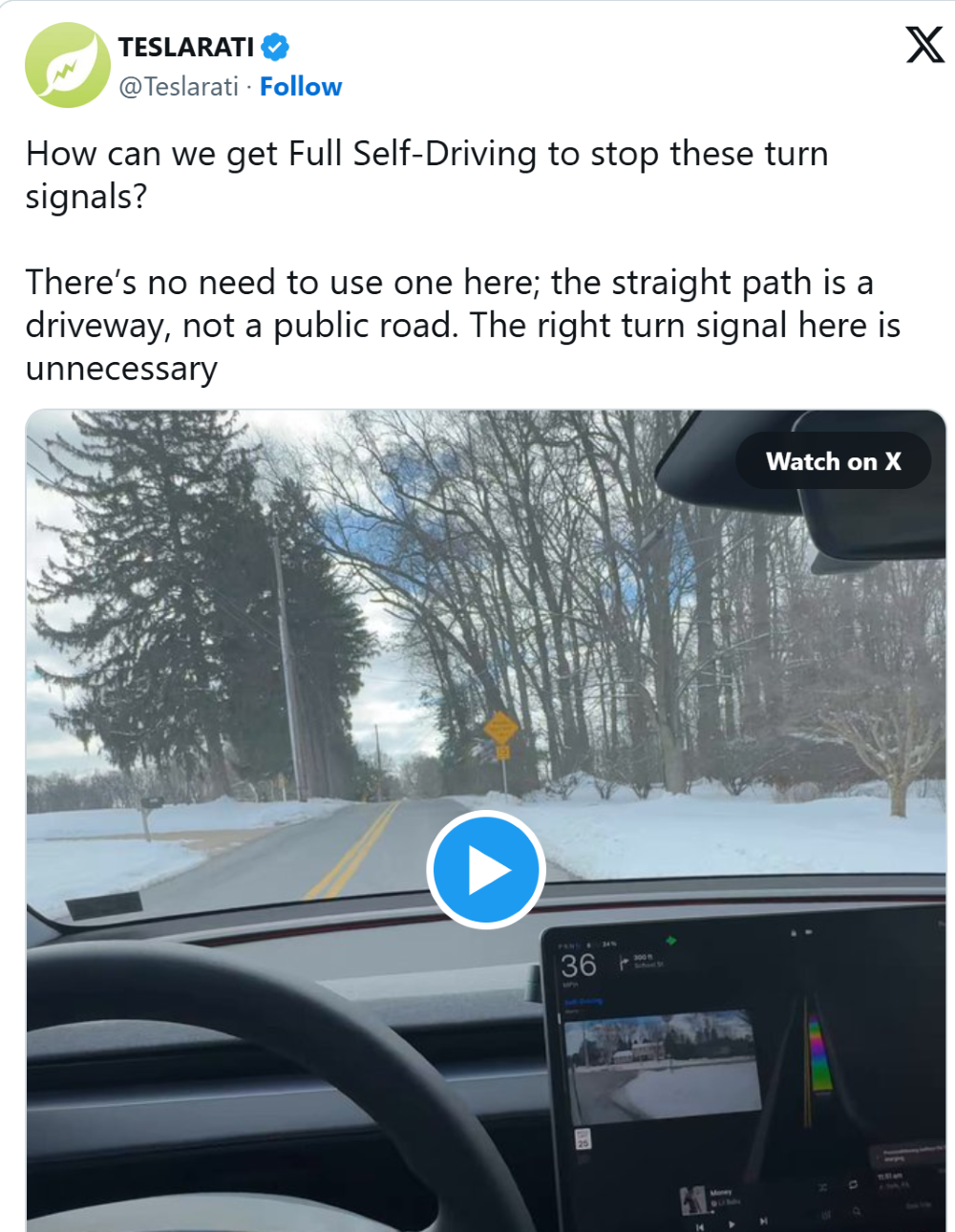 ▲Teslarati发帖称FSD在路过私人车道时误打右转向灯