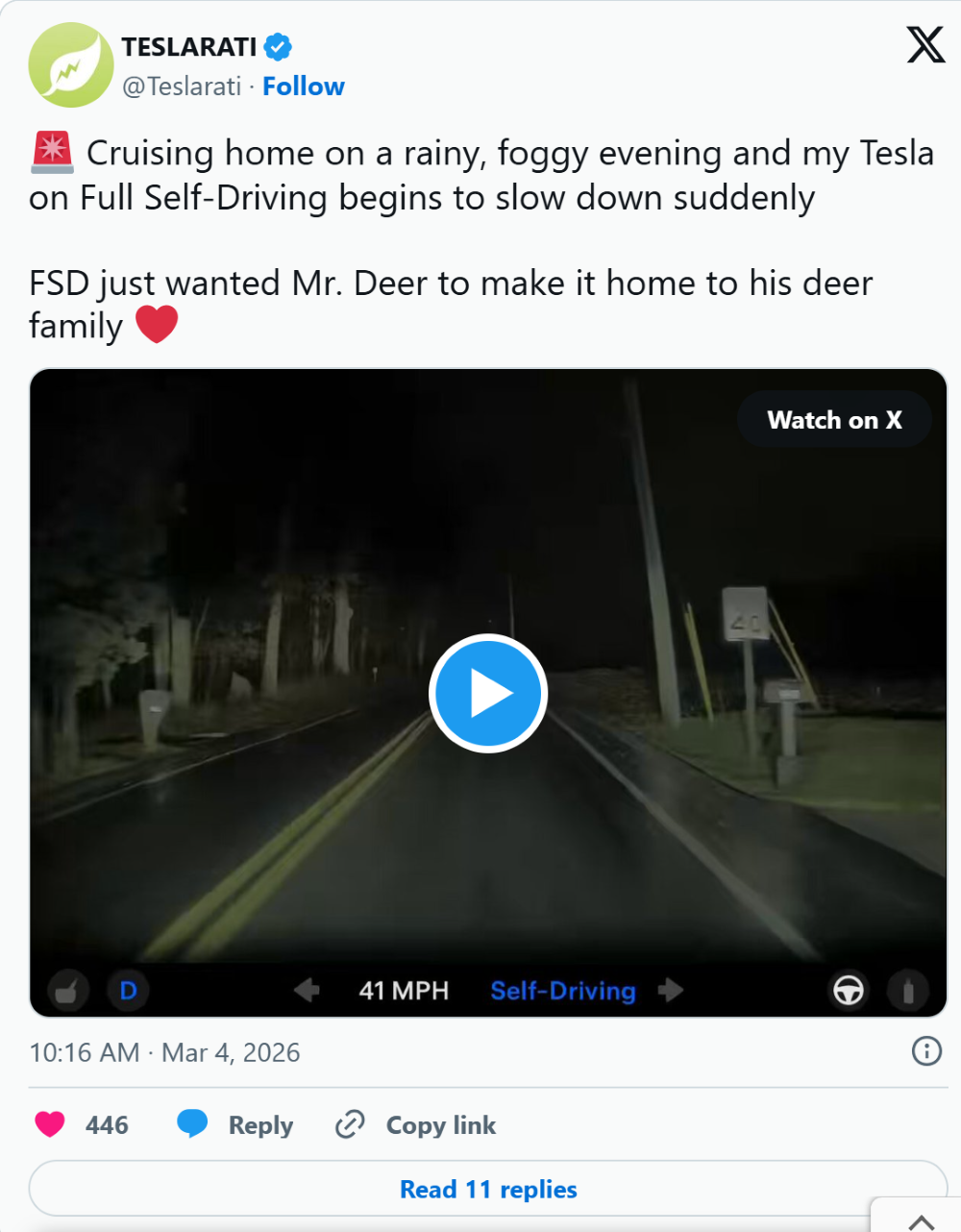 测试期间,车辆在学校区自动降速,跟随周边车流维持在约32公里/小时;同日夜间,系统检测到在路旁有一头鹿,并立即选择减速避让。据该记者介绍,这也是他使用FSD以来第一次遇到这两种情况。