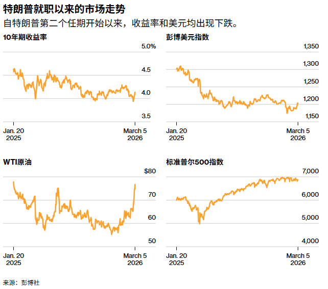 本周,彭博美元即期指数上涨逾1%,10年期国债收益率攀升约20个基点。然而,这两项指标仍显著低于特朗普去年上任时的水平——这主要归因于其政策及由此引发的不确定性对劳动力市场的持续冲击。