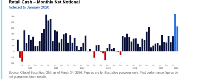 2026年1月创下Citadel平台历史上最大净买入月,2月则是第五大净买入月(创2021年4月以来新高)。