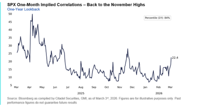 1个月和3个月的隐含相关性达到了自2025年11月以来的最高水平。隐含相关性的下降将表明宏观主导地位的减弱,从而为分散化投资和基本面选股创造更具建设性的环境。