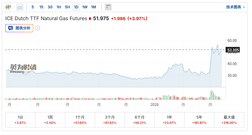 数据显示,欧洲基准天然气期货连续第二日上涨,盘中涨幅一度达7.7%,收复本周早些时候的部分失地。截至发稿,荷兰近月期货上涨3.97%,报每兆瓦时51.975欧元。