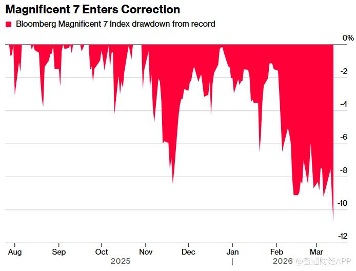 在地缘政治紧张和市场风险偏好下降的背景下,美股“七巨头”集体进入技术性回调区间。周五,追踪这些公司的科技七巨头指数收盘较去年10月创下的历史高点下跌超过10%,触及市场通常定义的“回调”水平。