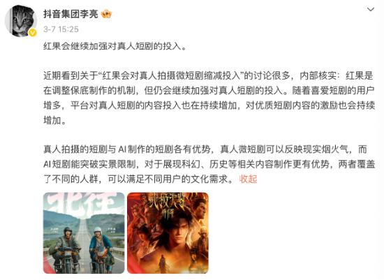 近日,“红果将砍掉九成真人短剧项目”“取消保底分成机制”等消息在社交媒体上快速传播。其后,抖音集团副总裁李亮在微博发文,明确表示“红果短剧是在调整保底制作的机制,但仍会继续加强对真人短剧的投入”。