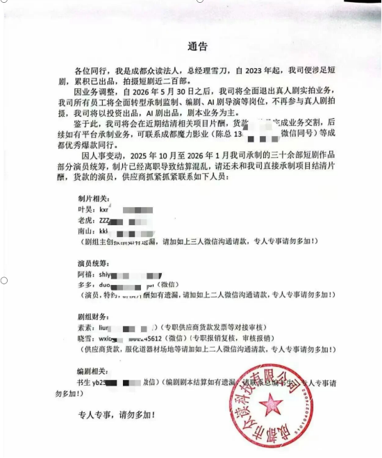 近日,知名短剧公司成都众读就发布了通告,宣布从今年5月30日之后,成都众读将全面退出真人剧实拍业务,所有员工将全面转向承制兼制、编剧、AI漫剧导演等岗位,不再参与真人剧拍摄,公司后续业务将以投资出品AI漫剧及剧本为主。