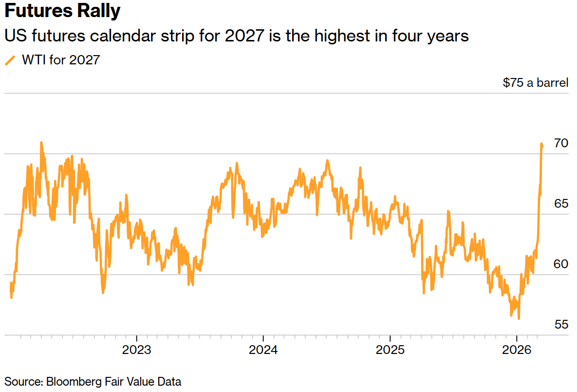 原油将于今年 4 月和 5 月交付,并在截至 2028 年 9 月的一个较长窗口期内归还。 2027 年的西得克萨斯中质油(WTI)期货价格比上周五收盘价高出近 1 美元,比一周前高出约 5 美元。相比之下,即将于近日到期的最近月 4 月期货合约比上周五收盘价低了近 2 美元/桶。