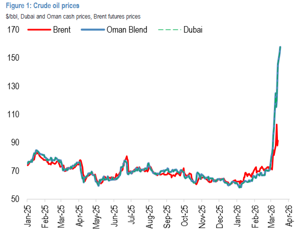 全球油价正在上演一场罕见的双轨分裂。布油和美油仍在100美元徘徊,而迪拜和阿曼原油现货价格已飙升至155美元/桶。