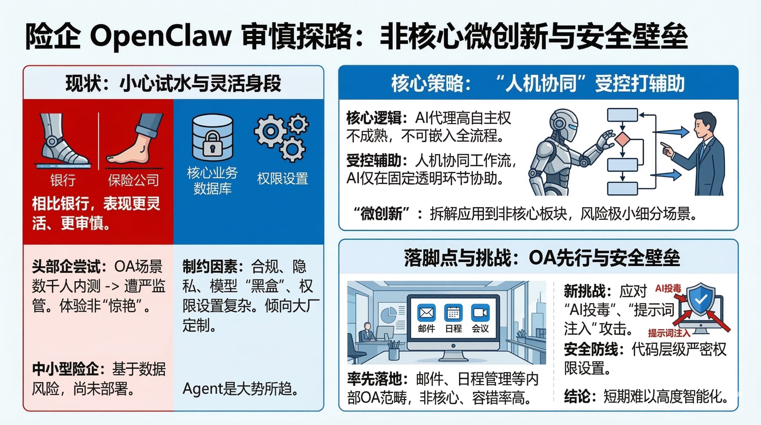 保险业身段更灵活,头部险企曾试点规模化应用但遭监管审视,行业共识趋向"非核心板块微创新",邮件、会议等OA场景预计率先落地。