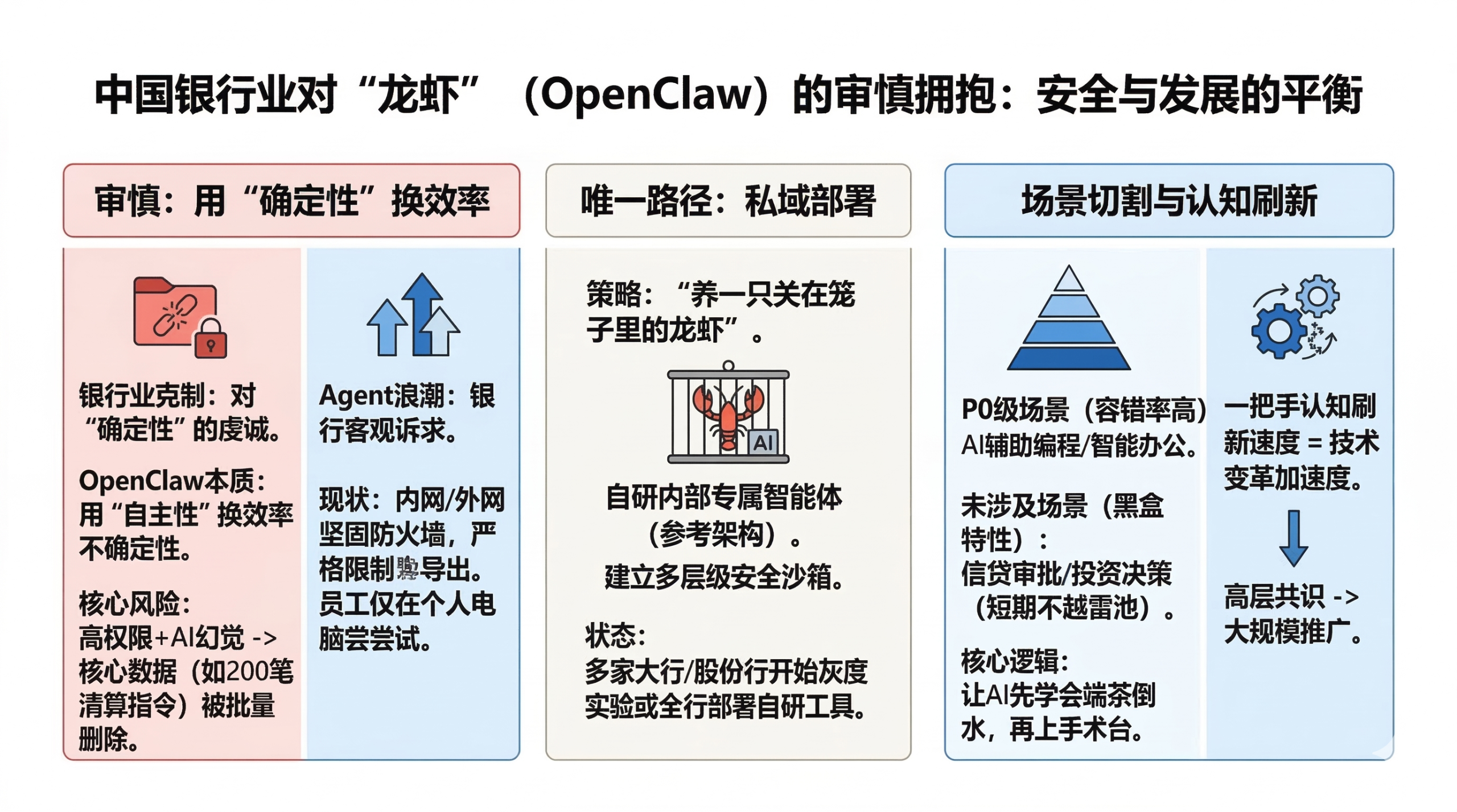 一侧是对极致效率的饥渴,另一侧是对系统失控的恐惧,这构成了当下金融机构"养龙虾"时的核心矛盾。
