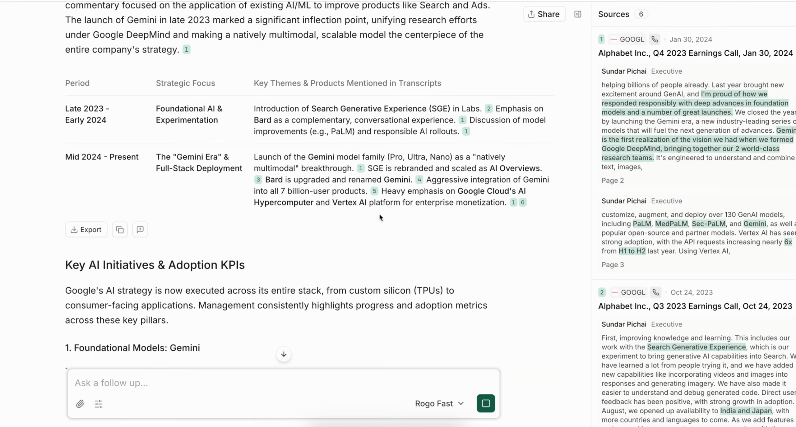 例如用户在Rogo中输入"根据财报电话会议 / 投资者演示文稿,梳理谷歌过去24个月的核心AI举措,分析其变化,并提取所有与AI产品采用情况相关的KPI指标",则其会对每条结论标注数据源脚注。