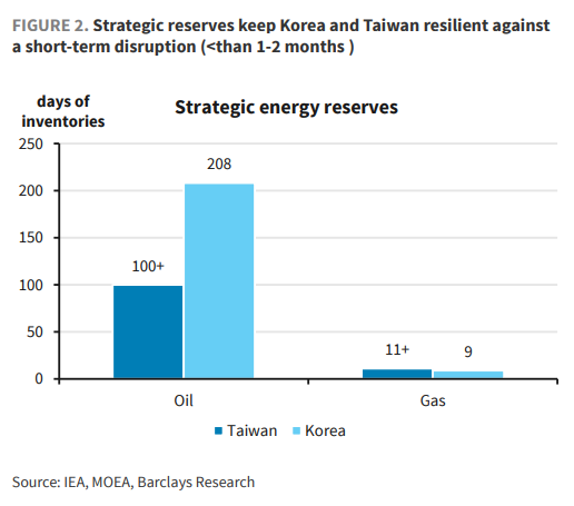 在外界看来,韩国和中国台湾地区两地拥有可观的战略石油储备,似乎足以应对短期冲击。然而,巴克莱在研报中拆解了这些数字背后的隐忧。