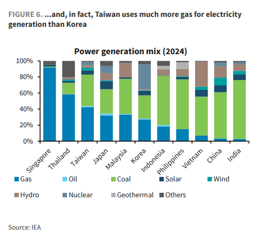 相比之下,台湾地区则面临结构性的“脆弱”。随着2025年5月最后一座核反应堆退役,台湾地区电力系统已完全丧失了核能弹性。目前,天然气发电占据其总发电量的48%(2025年数据)。