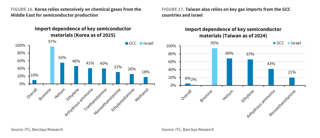 巴克莱数据显示,韩国和台湾地区两地在芯片蚀刻、清洗过程中必需的特种气体,对中东及以色列的依赖度达到了令人震惊的程度: