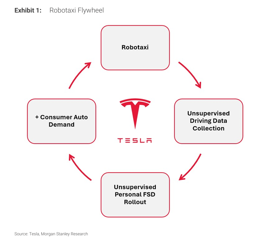 摩根士丹利提出的"Robotaxi飞轮"逻辑是:无监督Robotaxi积累的每一英里行驶数据,都将持续优化底层自动驾驶模型,进而加速个人FSD(完全自动驾驶)的无监督化进程,推动FSD搭载率提升、汽车需求改善及自由现金流增长。这意味着,Robotaxi商业化的成功不仅是出行服务收入的来源,更是提振核心汽车业务的重要杠杆。