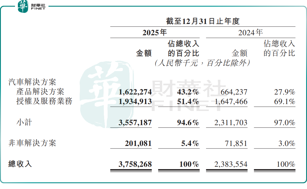 分业务看,汽车业务中,2025年,公司产品及解决方案业务营收跃升至16.22亿元,同比增长144.2%,占总营收比重从2024年的27.9%提升至43.2%,中高阶智驾硬件贡献该板块超80%的收入,成为增长主力军;授权及服务业务收入19.35亿元,同比增长17.4%,占比降至51.4%。